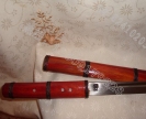 产品介绍: 此刀由户撒刀名匠线乔发全手工打制的极品酸枝木小棍刀,刀身采用精选汽车弹簧钢板手工锻打淬火,刀身精雕花纹,刀刃坚硬锋利,可刮汗毛,刀条流线型设计,流畅美观。刀装极品酸枝木传统工艺精做而成,刀鞘刀柄缠绕传统综丝,以使刀鞘更加结实耐用,民族风格浓郁,收藏精品!