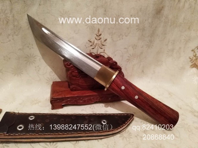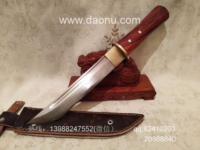 商品名称:户撒刀王(阿昌刀)精品皮壳直刀 商品规格:刃长20厘米左右 全长32厘米左右 厚度6毫米左右 商品详情:此刀为被列为云南省级非物质文化传承人的著名刀匠杨茂芳全手工锻打制作,刀条钢材为精选高碳锰钢,刀条千锤百炼而成,刃口局部淬火,刀条采用手工平磨,切割更为顺畅,独到的淬火方式使得刀条刚柔相济,粗锋砍铁不伤,细锋的话可达到轻松刮毛,配手工缝制的牛皮鞘,更加便携,刀柄为优质红酸枝贴合手型制作,握感舒适。此刀户外车载防身皆可,欢迎大家订购!