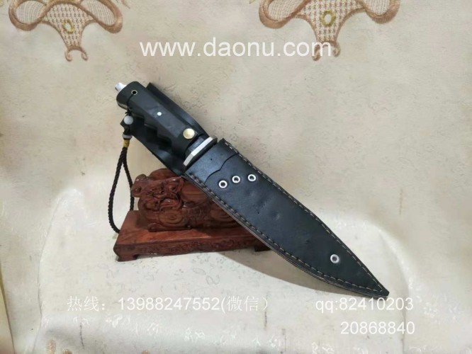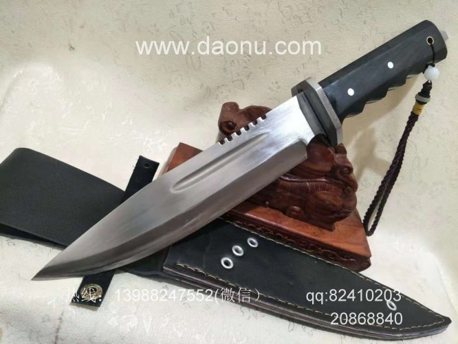 商品介绍:此刀为户撒优秀匠人采用优质高弹锰钢纯手工锻打制作的精品狼牙求生刀,刀条反复锻打并配方淬火而成,粗锋砍铁轻松顺畅,细锋可以锋利刮毛,此刀一出大受刀友欢迎和关注,刀体美观流畅,刀体全龙骨一体设计,硬度极高,尾端手工制作破窗锥,危机情况下可用来破窗,手柄黑檀木配合手型,更舒适不易滑脱!握感压手,一把不可多得的户外用刀!