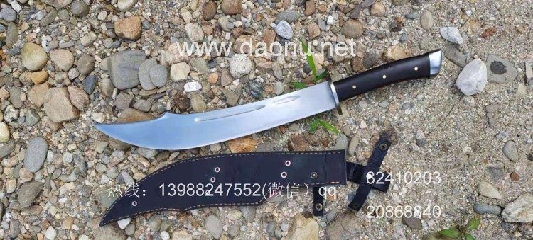 户撒刀名称:户撒刀王(阿昌刀)鬼头开山刀 户撒刀规格:刃长39CM左右 全长58CM左右 厚度CM左右 最宽处6MM左右 户撒刀简介:这款刀是给客户定做的一把超强鬼头刀,客户要求刀体要承受500斤的力量,人口硬度达到58HRC以上,于是精选军用车钢料,名匠全手工锻造,配方淬火,人口刚柔相济,斩钉截铁视同儿戏,刀条一体全龙岗锻造,尾端手工加钢垫,整刀显得更加紧凑强悍!配重和手感极佳,收藏 把玩 户外三位一体!