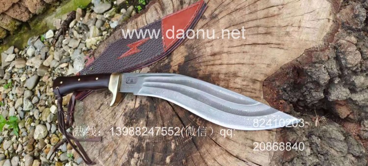 户撒刀名称:户撒阿昌刀王百炼花纹钢宽槽尼泊尔刀 户撒刀规格:刃长30CM左右 全长47CM左右 厚度7MM左右 户撒刀简介:此刀为户撒优秀匠人精选百炼花纹钢纯手工锻打的精品尼泊尔刀,刀型采用大名鼎鼎的尼泊尔军刀,此种刀型非常适合户外、防身,配重和手感非常舒适,劈砍力度极大,刀条经过匠人千百次反复锻打,并配方淬火,刃口坚硬锋利,轻松过竹砍铁,护手为纯铜手工制作,整个刀条一体全龙骨结构,极为耐用!配高档牛皮刀鞘,是户外把玩理想的选择!