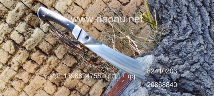 户撒刀简介:此刀采用优质高碳锰钢全手工锻打而成,刀型采用大名鼎鼎的户外名刀帕兰刀款式,此刀重心靠前,劈砍有力,切握感舒适!一体全龙骨刀身,刃口刚柔相济粗锋砍铁不伤,细锋轻松过竹,是户外不可多得的一把开路砍刀!这把刀做工精细,性能超强,户外爱好者不可错过!微信联系:13988247552