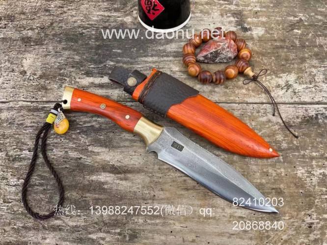户撒刀简介:此刀为户撒优秀刀匠纯手工锻打的一把优质精品猎刀,钢材采用特硬百炼花纹钢千锤百炼而成,手工开锋,刃口坚硬锋利,保持性耐磨性非常好,磨锋利可以轻松削A4纸,粗锋砍铁不伤!刀鞘刀柄为上等花梨木手工制作,护手和尾端加实心黄铜手工制作,在户外实用的同时又显得高端大气上档次!并且此款为促销宝贝,性价比非常高!