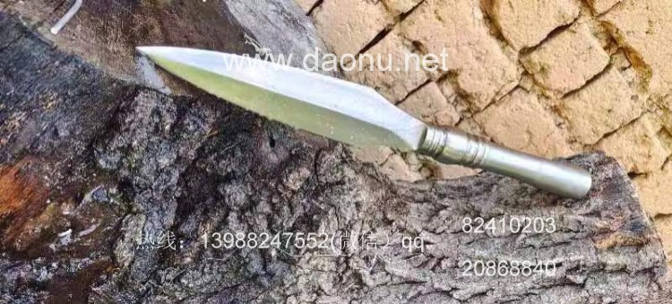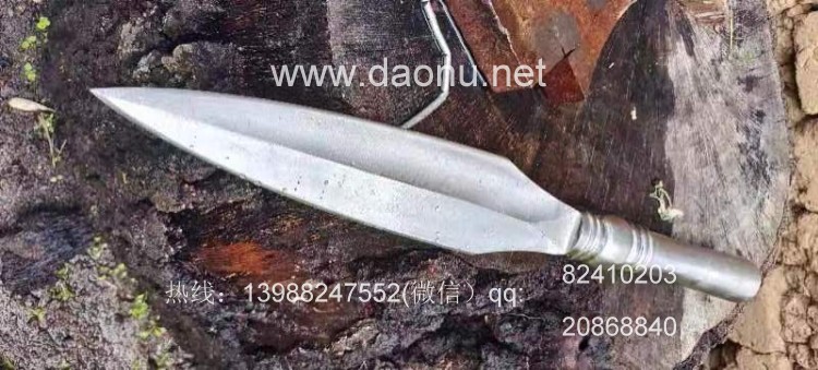 户撒刀名称:户撒精品火车弹簧锻打一体精钢枪头 户撒刀规格:刃长27CM左右 全长50CM左右 户撒刀简介:此枪头为户撒刀名匠杨茂芳采用火车粗弹簧纯手工锻打,户撒传统淬火而成,枪头采用完全一体锻打,无焊接!非常结实耐用,性能极佳,淬火枪头刚柔相济,硬度非常高,穿铁皮桶视若儿戏,大家喜欢收藏和联系的请抓紧时间定制,上山防野兽极佳兵器!