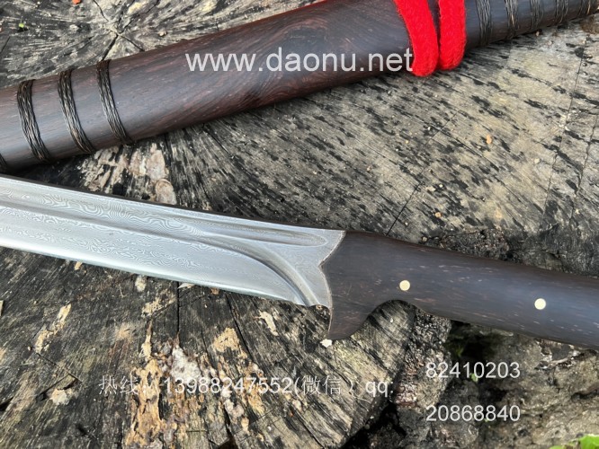 户撒刀简介:这款刀是客户提供影视原型,一把僵尸马刀,刀条是百炼花纹钢一体全龙骨手工锻造结实耐用,这款刀流线优美非常养眼,刀条锻打淬火后性能极佳,削纸的情况下可以砍铁丝,配黑酸枝刀柄刀鞘,这款刀相对轻便,方便携带,平时锻炼和户外都非常给力!
