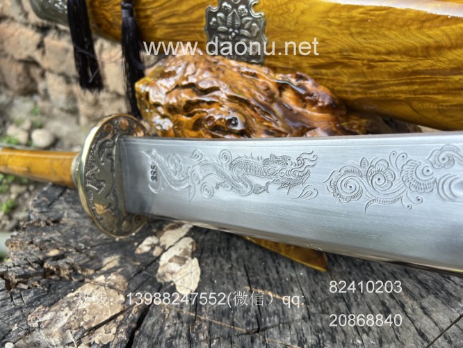 户撒刀简介:给客户定制的极品金丝楠闪电纹刀鞘的斩马王,户撒刀名匠线乔发手工锻打刀条,斩铁截钉性能一流!刀身手工精雕龙凤等民族吉祥图案,惟妙惟肖,线乔发的手工雕花工艺在户撒刀匠中也是首屈一指!刀鞘和刀柄采用的木料更是难得一见的金丝楠闪电纹,后面这种木料也是极难遇到了,妥妥的收藏极品!