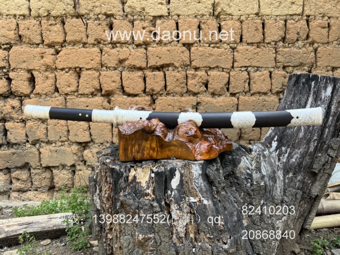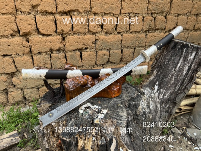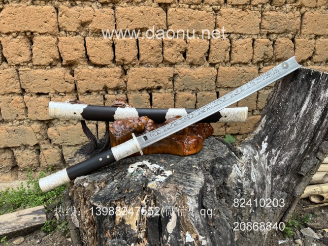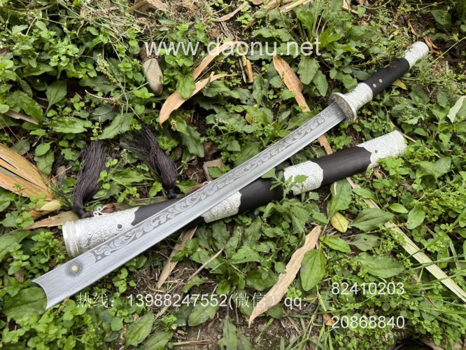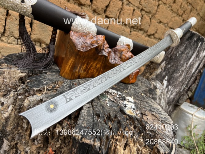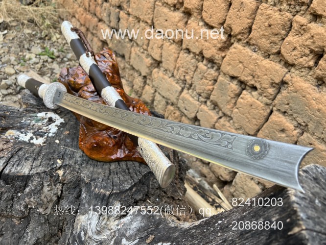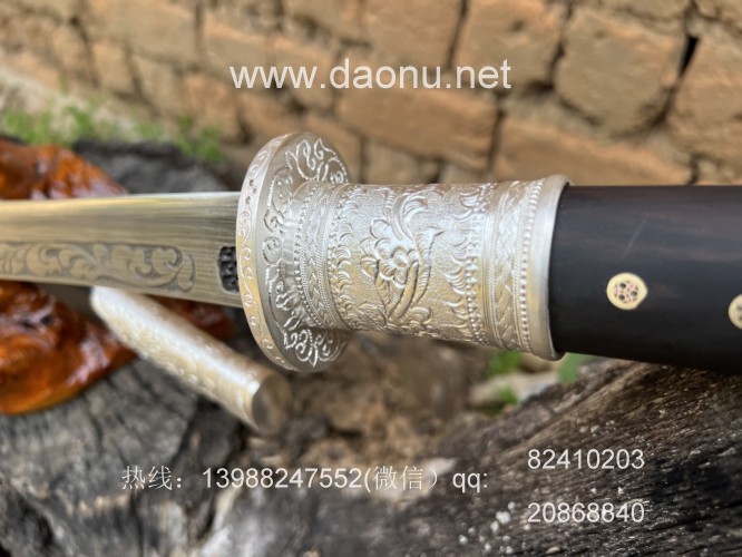 户撒刀简介:这款刀由户撒刀嫡派传人线乔发纯手工锻造,刀条采用特硬百炼花纹钢千锤百炼配方淬火而成,刚柔相济斩铁截钉,一体全龙骨锻造结实耐用,刀条表面手工雕刻唐草花纹,古香古色,刀鞘刀柄采用优质黑檀木手工制作,包厚99纯银配件,收藏实用皆可!