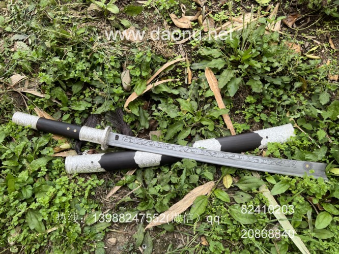 户撒刀名称:户撒阿昌刀高端纯银平头刀线乔发制作 户撒刀规格:刃长56cm左右 全长83cm左右 户撒刀简介:这款刀由户撒刀嫡派传人线乔发纯手工锻造,刀条采用特硬百炼花纹钢千锤百炼配方淬火而成,刚柔相济斩铁截钉,一体全龙骨锻造结实耐用,刀条表面手工雕刻唐草花纹,古香古色,刀鞘刀柄采用优质黑檀木手工制作,包厚99纯银配件,收藏实用皆可!
