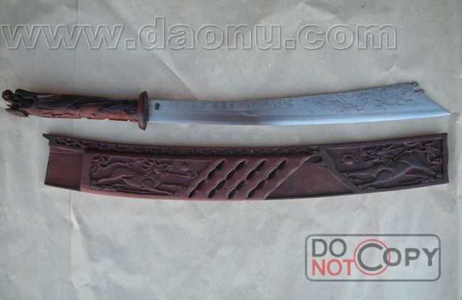 产品名称: 阿昌双龙龙头镇宅刀(江齐制作) 产品型号: 产品规格: 产品介绍: 此刀为户撒最具灵性的优秀刀匠项老赛妹夫线乔发亲手打制,刀身采用60硅二锰钢材刃口坚硬,可砍铁不伤。全长106CM*刀长88CM*刀把28.5CM*刀宽7CM*刀厚1CM*刀壳宽10CM;乌酸枝木刀把刀壳,精品镇宅刀系。收藏极品。