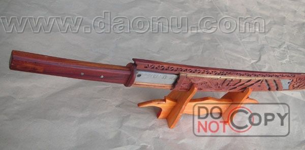 产品介绍: 此刀为户撒最具灵性的优秀刀匠项老赛妹夫线乔发亲自打制,刀身采用性能极佳的钢材60硅二锰,刃口淬火独到,可做到砍铁不伤,全长100CM*刀长80CM*刀把25CM.刀把刀鞘为稀有缅甸香小红木(硬木)制成,通体色泽淡红,极为美观,刀身手工精心打制(龙头刀尖,细刻双龙图案),属名贵精品收藏刀新品系.