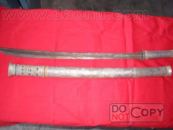 产品介绍: 此刀为100年前缅甸贵族佩戴的极品纯银手工银刀,整刀做工考究全锤百炼,从外形看明显有别于民间用刀,此刀在云南那种温湿环境下历经百年,刀锋依然锋利,刀体表面有少量锈迹,如经擦磨必将光亮如新。刀鞘采用上等纯银手工雕刻而成,雕工细致,百年之后刀鞘依然很少有泛黄发黑变色的情况,可见当时用料之考究,因此有极高的收藏研究价值,绝非仿品,贵族老刀仅此一把,该出手时就出手啊,呵呵!请有意收藏者仔细辨别!(细节图请看网页左边商品相册)