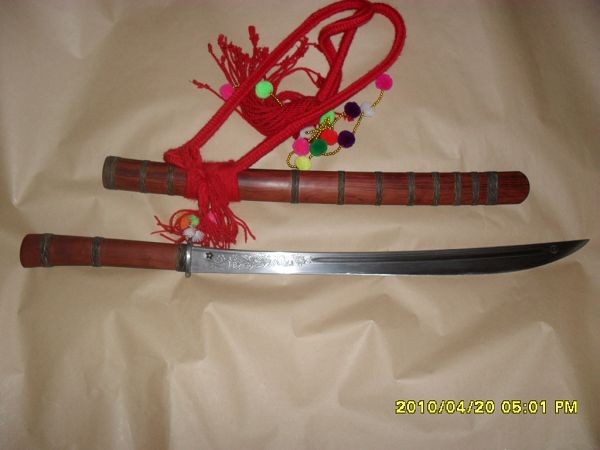 产品介绍: 此刀由户撒名匠线乔发全手工打制的极品苗刀,刀身采用汽车弹簧钢板手工锻打淬火,刀身精雕龙凤等花纹,刀鞘为红木制作.刀把为也红木木制作,能砍断钢筋而不伤刃,极具收藏价值,此刀为一高级客户定制,客户收到此刀后立即来电要求再做一把一模一样的,可见此刀只好!收藏极品!