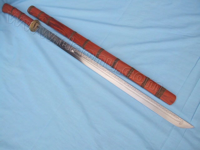 产品介绍: 此刀由户撒名匠全手工打制的精品直刀,刀身全龙骨采用汽车弹簧钢板手工锻打淬火,刀身精雕龙凤等花纹,珍惜红木刀装,过竹削铁!收藏极品!