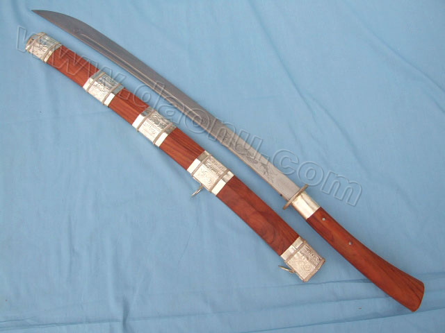 产品介绍: 此刀由户撒名匠全手工打制的精品马刀,刀身采用汽车弹簧钢板手工锻打淬火,刀身精雕龙凤等花纹,刀装为红木缅银六方壳刀装,全龙骨,可过竹削铁!收藏极品!