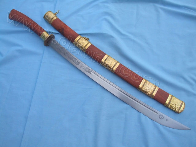 产品介绍: 此刀由户撒名匠全手工打制的精品马刀,刀身采用汽车弹簧钢板手工锻打淬火,刀身精雕龙凤等花纹,精铜红木刀装,可过竹削铁!收藏极品!