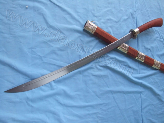 产品介绍: 此刀由户撒名匠全手工打制的精品苗刀,刀身采用汽车弹簧钢板手工锻打淬火,刀身精雕龙凤等花纹,精铜红木缅银刀装,可过竹削铁!收藏极品!