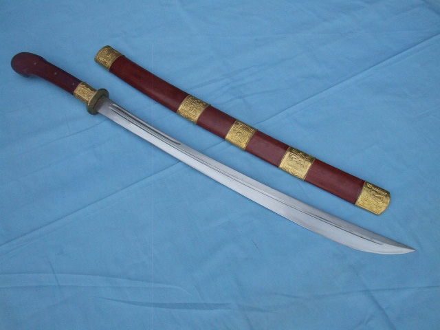 产品介绍: 此刀是户撒名匠全手工打制的珍藏版紫檀精铜装极品马刀,刀身采用汽车弹簧钢板手工锻打淬火,刀身精雕龙凤等花纹,精铜红木刀装,做工精良,刀的钢火一流!刀鞘刀把为存世稀少的缅甸紫檀木.镶饰精美纯铜装,独具一格的刀款华贵古朴大方,可过竹削铁,存世只此一把,极其收藏价值!!