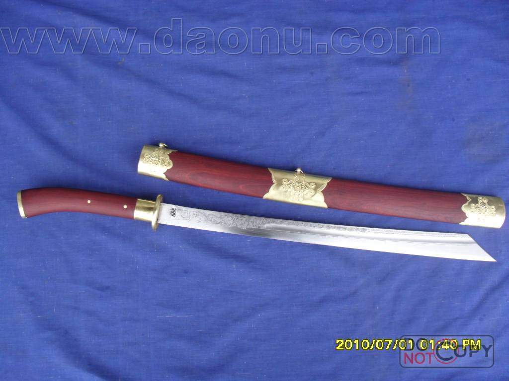 产品介绍: 此刀由户撒名匠线乔发全手工打制的极品苗刀,刀身采用汽车弹簧钢板手工锻打淬火,刀身精雕龙凤等花纹,刀鞘为缅甸红木制作.刀把为也红木木制作,能砍断钢筋而不伤刃,极具收藏价值,此刀为一高级客户定制,收藏极品!