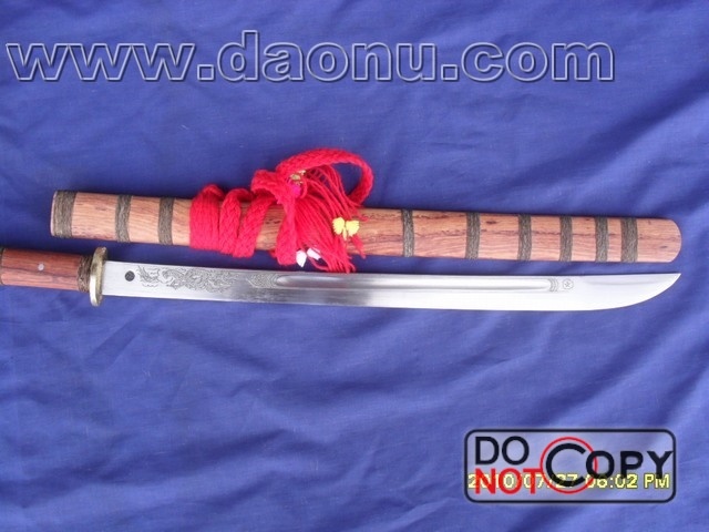 产品介绍: 此刀由户撒名匠户撒刀刀王大赛第二名段生华全手工打制的精品苗刀,刀身采用汽车弹簧钢板手工锻打淬火,千锤百炼而成,刃口粗锋坚硬可砍断铁钉不伤刃,精细开锋可锋即可锋利无比,刀身精雕龙凤等花纹。刀装采用野生红酸枝木木制作,整体感官大气实用,收藏佳品!