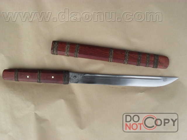 产品介绍: 此刀由户撒名匠线乔发全手工打制的极品短刀,刀身采用汽车弹簧钢板手工锻打淬火,刀身精雕龙凤等花纹,刀鞘为缅甸红木制作.刀把为也红木木制作,刃口经乔发精心打磨,可轻松刮汗毛,极具收藏价值,收藏极品!
