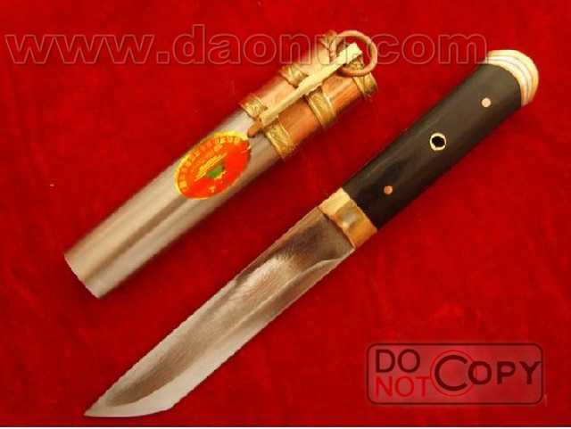 工序简介:刀刃,折花,将×道钢和×道铁(工业机密)烧红后揉到一起,便形成了刀刃上那写形形色色的花纹。折花刀匠人在30多年前,因病去世,他所掌握的折花刀的技术也随他深深埋进了坟墓里。在这之后,很多人曾尝试做 折花刀,而每次因失败而告终。因为,在打制折花刀的火候、钢性、淬火温度都很难掌握,因此在断断续续尝试做了1年,没有成功。在2000年,大河家保安族腰刀厂聘请本地顶尖匠人开始研究制作折花刀,在2001年由于某种原因终止。2005年腊月,再次进行了折花刀的研究制作,在三名顶尖匠人花了一年零六个月之后,于2007年4月28日成功出炉了第一把 折花刀刀坯,于5月1日完成全部工序。刀柄由护口、小把、平落、骨朵、弯落、盖噶等组成,做工复杂,所用原料有:精选牛角、牛骨、红铜、黄铜、铁、梅花、管铅等。刀鞘由铜皮做成,照样板裁下后,经手工卷、拷、焊(银焊)、揎、磨光,完了要钉压条、箍、牙飞、秫秫、转挂,最后插进用手削好的木鞘。