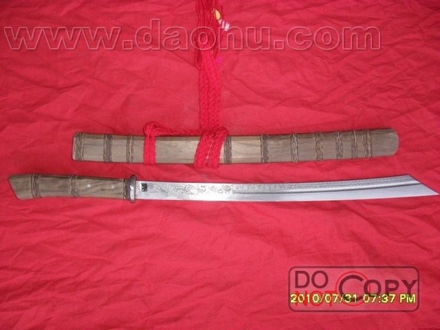 产品介绍: 此刀由户撒一流名匠线乔发全手工打制的精品小型斩马刀,刀身采用汽车弹簧钢板手工锻打淬火,刀身精雕龙凤等花纹,优质楠木刀装,做工精细,淬火独到。可过竹削铁!收藏极品!