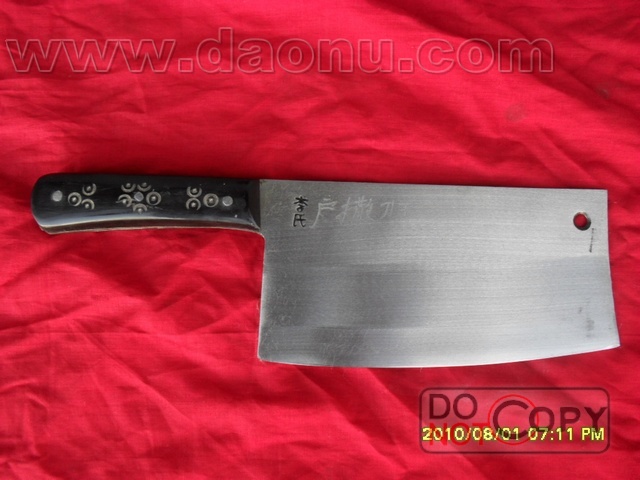 产品介绍: 此刀由户撒有名制刀名匠李德永全手工打制的优质家用菜刀,刀身采用汽车弹簧钢板手工锻打淬火,刀柄为耐用牛角把,刃口锋利甚至可刮毛,用这个菜刀切菜下厨,长期不用磨刀,非市面普通机制菜刀可比。