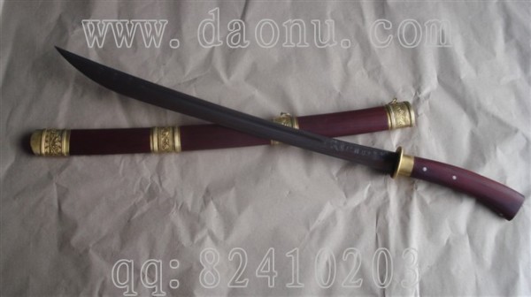 产品介绍: 此刀由户撒优秀工匠全手工打制的精品苗刀,刀身采用汽车弹簧钢板手工锻打淬火,刀身精雕龙凤等花纹,刀装为大叶紫檀也称缅甸红木刀装,刀装打蜡后呈紫色,防滑耐用,样式流畅美观,可过竹削铁!实用镇邪之宝刀,收藏极品!