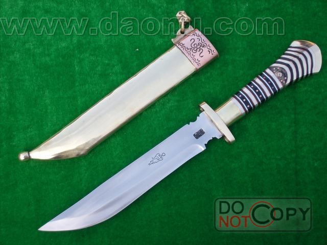 此刀系保安族腰刀著名刀匠马一阿吉所制,刀体采用通背夹钢工艺,刀刃硬度很高,刀背略低,刀口的硬度与韧性的结合天衣无缝,为保安腰刀中的极品,此刀是新近开发的新品保安腰刀之一,刀型流畅美观,锋利无比、寒光闪闪,深得广大刀友的喜爱和推崇。