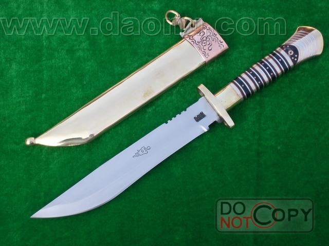 此刀系保安族腰刀著名刀匠马一阿吉所制,刀体采用通背夹钢工艺,刀刃硬度很高,刀背略低,刀口的硬度与韧性的结合天衣无缝,为保安腰刀中的极品,此刀是新近开发的新品保安腰刀之一,刀型流畅美观,锋利无比、寒光闪闪,深得广大刀友的喜爱和推崇。