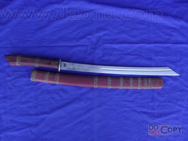 产品介绍: 此刀由户撒名匠线乔发全手工打制的极品大叶紫檀斩马刀,刀身采用汽车弹簧钢板手工锻打淬火,刀身精雕花纹,刃口坚硬,粗锋可砍钢筋,精细开锋锋利无比,刀鞘刀把采用大叶紫檀外包缅银精工制作而成,此刀造型极具美感手感一流,经典刀型极具收藏价值,路过不要错过!