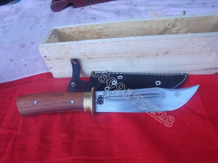 户撒刀(阿昌刀)说明:户撒刀(阿昌刀)全手工打制,韧性和硬度达到高度统一,刃口坚硬刀背稍软,以保证刀在受大力冲击情况下尽量避免断裂,具体手工刀和机制刀的区别大家可参看本网站宝刀资讯栏目了解。手工产品把把略有不同,所以大家看到商品图片时如需订做,所得产品会略有差别(例如雕花、长度或规格等)当然大体不会改变,这也正是手工刀魅力所在。