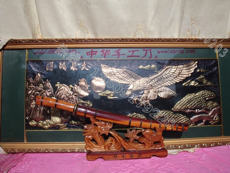 产品介绍: 此刀为户撒刀名匠线乔发全手工精心打制,刀条为传统马刀样式,多次淬火而成,刃口在砍铁的同时也比较锋利,刀身精雕龙凤,刀装为精品楠木刀装,是传统户撒刀精品系列!传统收藏请勿错过!