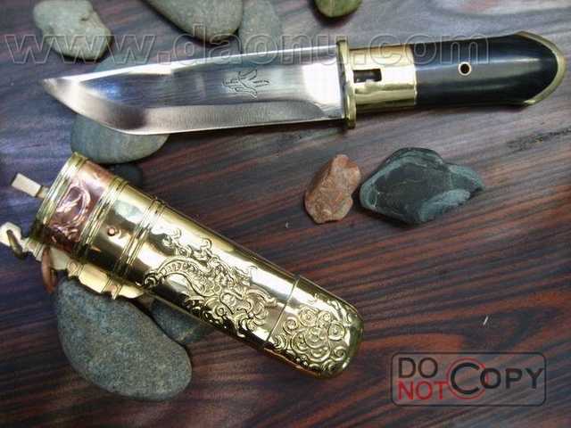 工序简介:刀刃,加钢,刀刃上刻有一把手图样;刀柄由护手、秫秫、珠子(落巴)、盖噶等组成,所用原料有:精选牛角、红铜、黄铜、铁等。刀鞘由铜皮做成,照样板裁下后,用一种鞘的模子砸出鞘面上的龙、花花草草的图案,然后经手工卷、拷、焊(银焊+锡焊)、揎、磨光,完了要钉秫秫、环子,最后插进用手削好的木鞘。