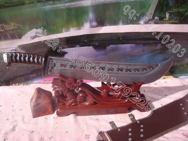 产品介绍: 这把刀是客户从中国历史博物馆拍照而来的一把青铜出土文物原型,这把刀大气粗犷野性十足中透漏出无限杀气,这位朋友拜托我们让乔发仿此刀订做,经过仔细分析图纸,我们和乔发研制出了这把国内暂时还没人做的古刀造型,此刀精选弹簧钢打制,刀厚9毫米左右,宽度8厘米左右,沉重威猛,用这把刀砍钢筋轻松完胜,客户收到后也对硬度等方面做了测试,比较对象是家里的世界名刀,世界名刀完败。这把刀比较难做,特别是刀身的花纹,看似简单手工做起来非常费时费力,乔发用了整一天时间。不世收藏请,希望大家不要错过。