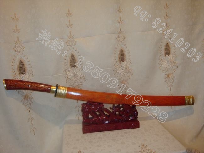 产品介绍: 此刀为客户特殊定制的高档镶丝酸枝木斩马刀(也称高锰碳钢)经户撒名匠线乔发精选优质弹簧钢,精心打制而成,刀身经过反复锻打,刃口进行多次复合淬火,这把极品斩马刀诞生了,此刀口做工细腻,亮光闪闪,可轻松斩断钢筋,刀身雕工细腻如丝,精雕龙凤栩栩如生,宝刀出鞘威势如虹!这把刀装为缅甸精品酸枝木(红木中最好的一种木料,油性大,分量重,在北方干旱情况下不开裂,本站极品刀剑都推荐此种木料)刀鞘包铜并精工镶嵌铜丝而成,付款后立即排队订制,机不可失!