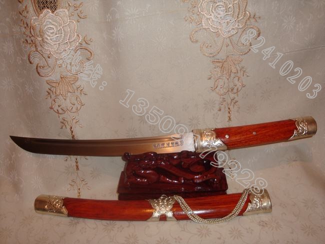 产品介绍: 此刀为极收藏马刀系列,经户撒名匠线乔发精选优质弹簧钢(也称高锰碳钢),精心打制而成,刀身反复锻打,刃口经过数次复合淬火,此刀口做工细腻,线条流畅,粗锋可砍铁不伤,如果精磨可锋利刮毛,这把刀装为缅甸精品酸枝木(红木中最好的一种木料,油性大,分量重,在北方干旱情况下不开裂,本站极品刀剑都推荐此种木料)此刀刀装也是一个亮点,整体包优质缅银,刀装师傅也是户撒最好的师傅,刀鞘师傅手工费也相应大幅提高,再配合名匠乔发的高超手艺,整刀更显贵族气息和王者风范。收藏极品,不可多得。此刀现进行成本价促销中并且现货,请立即抢购。