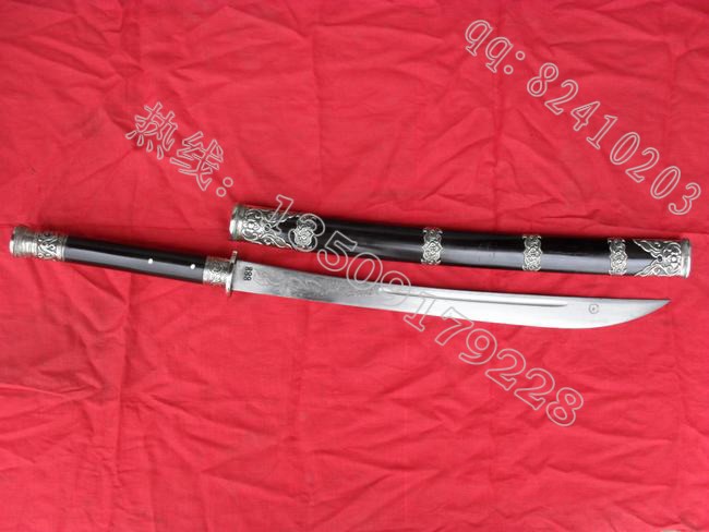 产品介绍: 此刀是缅甸和泰国客商专门定制的高档皇家护卫刀具,经户撒名匠线乔发采用传统户撒的锻打工艺精选优质高锰碳钢精心打制而成,刀身经过不断实践反复锻打,刃口数次特殊方法淬火,刃口硬度极高,此刀口做工细腻,线条流畅,刀身精雕双龙,这把刀装为极品乌木制作,外包精包缅银,刀装师傅也采用户撒最好的师傅,使整刀显王者风范!收藏极品,不可多得。