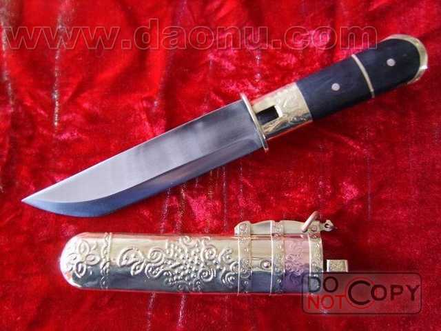 工序简介:刀柄由护手、秫秫、珠子(落巴)、盖噶等组成,所用原料有:精选牛角、红铜、黄铜、铁等。刀鞘由铜皮做成,照样板裁下后,用一种鞘的模子砸出鞘面上的龙、花花草草的图案,然后经手工卷、拷、焊(银焊+锡焊)、揎、磨光,完了要钉秫秫、环子,最后插进用手削好的木鞘。