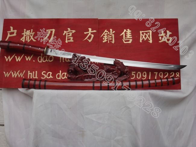 产品介绍: 加长精钢马刀!此刀由中华手工刀网联合户撒名匠线乔发倾心打制而成,钢材采用精挑弹簧钢制成(也称高锰碳钢,我们站现今大部分刀条都是用这种钢材打制而成),刀条、刀型经名匠乔发仔细推敲精心制作,属于特质加强版,此刀寒光闪闪,砍铁不伤,刀刃雕工细腻如丝,精雕龙凤栩栩如生,如果在古代这把刀的杀伤力是非常强的,刀柄采用优质大叶紫檀缠综丝手工制成,刀芯超长非常结实,再怎么挥砍也不会有任何意外!走过路过不要错过!收藏极品!