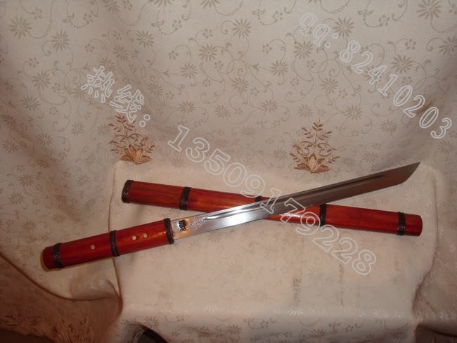 产品介绍: 此刀由户撒刀名匠线乔发全手工打制的极品酸枝木小棍刀,刀身采用精选汽车弹簧钢板手工锻打淬火,刀身精雕花纹,刀刃坚硬锋利,可刮汗毛,刀条流线型设计,流畅美观。刀装极品酸枝木传统工艺精做而成,刀鞘刀柄缠绕传统综丝,以使刀鞘更加结实耐用,民族风格浓郁,收藏精品!