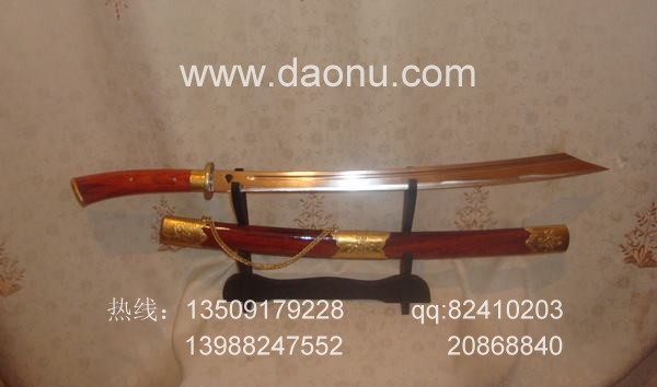 产品介绍: 此刀为户撒当今斩马刀之极品,经户撒名匠黎有兴采用本站独家进口的特殊钢材精心打制而成,这种钢材锻打难度极高,经过不断实践反复锻打,刃口数次特殊方法淬火,此刀横空出世,此刀口做工细腻,线条流畅,刃口硬度极高,此刀已刃口磨的相当锋利,也可砍断铁丝不伤刃口。刀身防锈能力也大大超过户撒当地的高弹锰钢系列,收藏价值也进一步提高。这把刀装为缅甸精品酸枝木(红木中最好的一种木料,油性大,分量重,在北方干旱情况下不开裂,本站极品刀剑都推荐此种木料)收藏极品,不可多得。