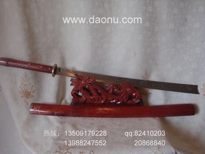产品介绍: 此刀由户撒名匠线乔发全手工打制的极品平头刀,刀身采用进口汽车弹簧钢板(高弹锰钢)手工锻打淬火,淬火工艺为秘方混合淬火方式,边打边淬。刀身精雕龙凤等花纹,刀鞘刀柄为珍贵缅甸红木制作.刀鞘制作精美,手工镶嵌铜丝,工艺复杂,此刀经过几天的精细打磨已经极度锋利,甚至胜过剃刀,所以可轻松甩断干毛巾,此刀极具收藏表演价值,不可多得。