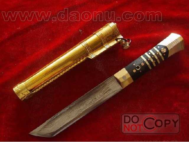 工序简介:刀刃,折花,将×道钢和×道铁(工业机密)烧红后揉到一起,便形成了刀刃上那写形形色色的花纹。折花刀匠人在30多年前,因病去世,他所掌握的折花刀的技术也随他深深埋进了坟墓里。在这之后,很多人曾尝试做 折花刀,而每次因失败而告终。因为,在打制折花刀的火候、钢性、淬火温度都很难掌握,因此在断断续续尝试做了1年,没有成功。在2000年,大河家保安族腰刀厂聘请本地顶尖匠人开始研究制作折花刀,在2001年由于某种原因终止。2005年腊月,再次进行了折花刀的研究制作,在三名顶尖匠人花了一年零六个月之后,于2007年4月28日成功出炉了第一把 折花刀刀坯,于5月1日完成全部工序。刀柄由护口、小把、平落、骨朵、弯落、盖噶等组成,做工复杂,所用原料有:精选牛角、牛骨、红铜、黄铜、铁、梅花、管铅等。刀鞘由铜皮做成,照样板裁下后,经手工卷、拷、焊(银焊)、揎、磨光,完了要钉压条、箍、牙飞、秫秫、转挂,最后插进用手削好的木鞘。
