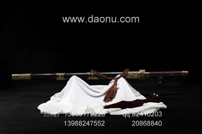 【品名】龙泉刀剑之花纹钢镇邪剑 【规格】全长109CM 刃长73CM 【重量】全重2100g 【刃材】花纹钢【鞘材】朴木 【装材】纯铜做旧 【鞘材】上等黑檀木