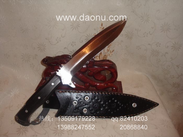 产品介绍: 此刀为阿昌族优秀刀匠全手工精心打制,刀条采用优质进口高碳锰钢,传统户撒手工锻打结合现代实用刀型外观,千锤百炼后秘方淬火热处理而成,刀身精心设计,刀刃流畅,刀身锯齿状外形为全手工剪制,非常费时费力,刀柄为纯手工制作的珍惜黑檀木刀柄,手感舒适耐用。刀鞘纯牛皮内垫防锈纸板。此刀刃口可非常锋利甚至可刮毛,户外收藏俱佳!请大家抓紧时间定制。
