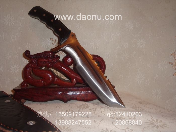 产品介绍: 此刀为阿昌族优秀刀匠全手工精心打制,刀条采用优质进口高碳锰钢,传统户撒手工锻打结合现代实用刀型外观,千锤百炼后秘方淬火热处理而成,刀身精心设计,刀刃流畅,刀身锯齿状外形为全手工剪制,非常费时费力,刀柄为纯手工制作的珍惜黑檀木刀柄,手感舒适耐用。刀鞘纯牛皮内垫防锈纸板。此刀刃口可非常锋利甚至可刮毛,户外收藏俱佳!请大家抓紧时间定制。