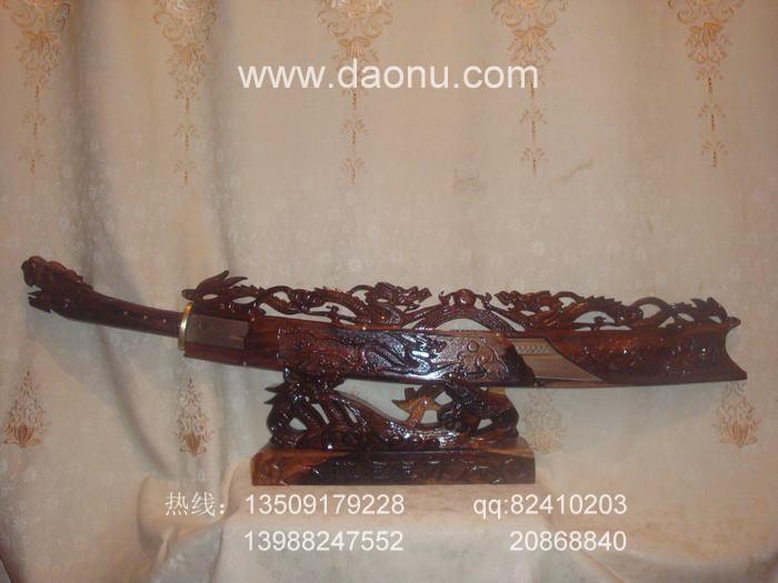 产品介绍: 此刀由户撒优秀匠人全手工打制的精品镇宅斩马刀,刀身采用汽车弹簧钢板手工锻打淬火,千锤百炼而成,刃口坚硬粗锋可砍断铁钉不伤刃,刀身精雕龙凤等花纹。刀装采用缅甸及其名贵的鸡翅木精雕细琢而成,整体感官大气高贵,气势如虹!收藏集玩家的首选!此刀本月精品现货!收藏极品! (商品图片经压缩清晰度下降,真品更好),另外答谢刀友,购买此刀者赠送下图精品刀架(价值500元)
