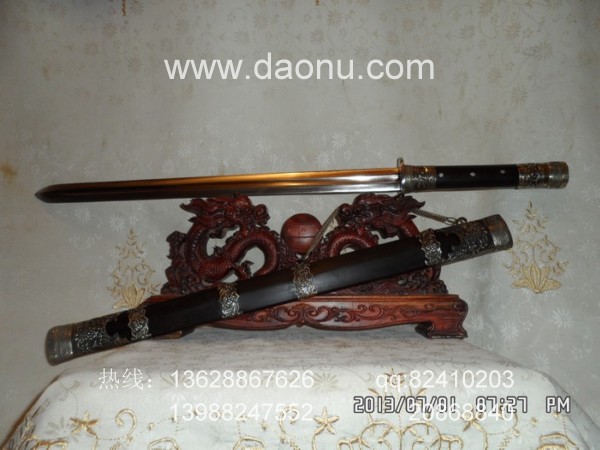 产品介绍: 此剑为户撒当今宝剑之极品系列,经户撒名匠黎有兴采用本站独家进口的特殊钢材精心打制而成,这种钢材锻打难度极高,经过不断实践反复锻打,刃口数次特殊方法淬火,宝剑鼎成,宝剑做工扎实,线条流畅,刃口硬度极高,反复淬火回火后刃口达到刮毛还能砍断铁丝的境界,刀身防锈能力也大大超过户撒当地的高弹锰钢系列,收藏价值也进一步提高。此次制作,比前面制作更为加强,采用全龙骨设计,使得整个宝剑更为结实耐用,剑尾端也进行包缅银处理。此剑剑鞘采用名贵黑檀木外包缅银,此刀刀装也是一个亮点,整体包优质缅银,刀装师傅也是户撒最好的师傅,使整刀显王者风范!收藏极品,不可多得。