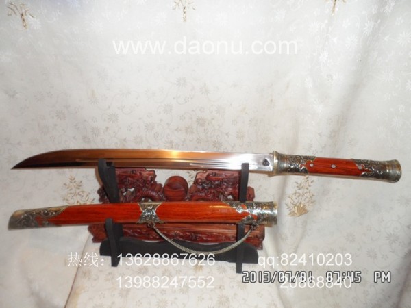 产品介绍: 此刀为户撒刀之极品高档进口钢材系列,刀条经户撒名匠黎有兴采用本站独家进口的特殊钢材精心打制而成,此种钢材锻打难度极高,必须经过长时间不断实践反复锻打,刃口需经过数次特殊方法淬火,而后宝刀鼎成。宝刀做工扎实,流线刀刃,刃口硬度极高,反复淬火回火后刃口达到刮毛还能砍断铁丝的境界,刀身防锈能力也大大超过户撒当地的高弹锰钢系列,收藏价值极高。刀柄采用全龙骨设计,使得整个苗刀更为结实耐用,此刀刀鞘采用名贵缅甸红酸枝木外包缅银,整刀彰显王者风范!收藏极品,不可多得。